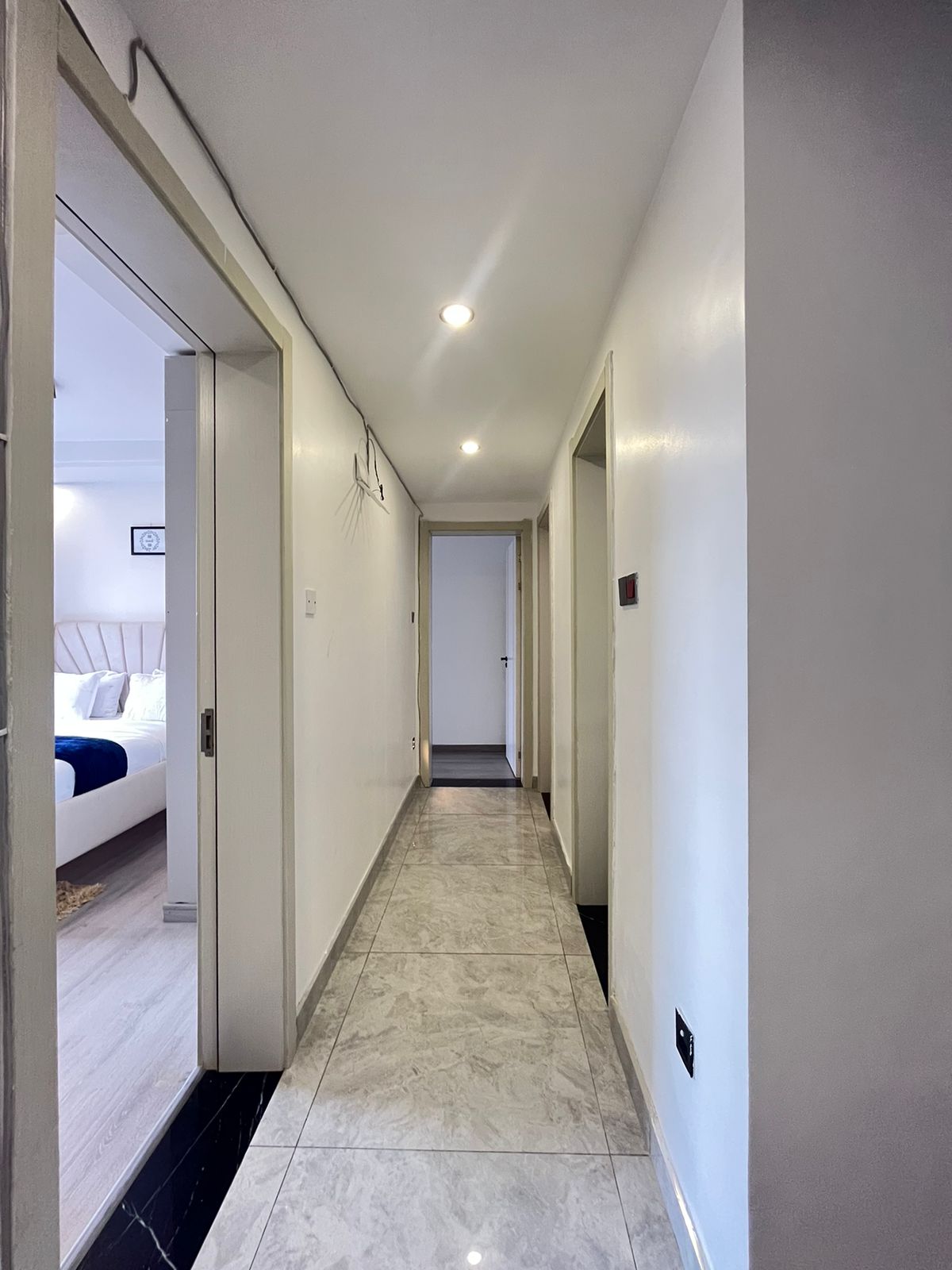 The kitchen is fully fitted with modern appliances such as an extractor hood, hob, microwave, and oven. Two bedrooms are all ensuite with a free-standing instant shower with a glass cubicle. The primary bedrooms come with marble tiling, free-standing rain shower, and vanity sinks. This beautifully designed apartment is complimented with a swimming pool, gym, children's play area,2 car parking, borehole water/NCC supply high-speed elevators, and a rooftop terrace. Additionally, the apartment has a key card access,CCTV cameras manning the common areas, an Electric fence surrounding the entire building as well as day/night security guards.
